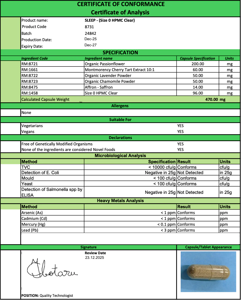 For when your body is tired but your brain won't switch off. Our blend of Saffron and Passionflower helps quiet the endless loop of worries, easing you into a state of natural calm so you can finally drift off.